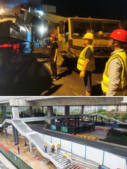 由于人行天橋項目建設所處的位置地下含高壓線(xiàn)等管線(xiàn),施工環(huán)境較為復雜,且又處在交通通行量大的東環(huán)高速高架橋下,由于空間受限,鋼箱梁吊裝與高架橋最近的距離僅有5公分,吊裝難度極大。為此,我們采取雙吊車(chē)協(xié)同施工、錯峰施工和夜間施工的辦法。為確保施工安全,市政集團從上至下高度重視,由集團領(lǐng)導帶隊,項目總工及各職能部門(mén)主要人員齊上陣,從交通協(xié)調,運梁車(chē)跟隨指導,安全措施落實(shí)及現場(chǎng)架梁的線(xiàn)位等多方面進(jìn)行把控,主要負責人靠前指揮,帶領(lǐng)黨員干部及時(shí)協(xié)調解決吊裝過(guò)程中遇到的問(wèn)題,充分發(fā)揮出黨支部戰斗堡壘和黨員的模范帶頭作用。
