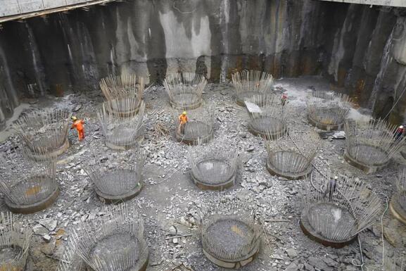 8月24日,繼龍巖大道高架橋主橋主塔樁基、承臺基坑開(kāi)挖完成后,項目已進(jìn)入主塔承臺施工階段,主橋封底混凝土澆筑完成0.75米(共1.5米),主橋轉體關(guān)鍵設備鑄鋼球鉸已生產(chǎn)完成,現場(chǎng)正進(jìn)行樁頭破除作業(yè)。由于連續橫跨贛龍鐵路、龍廈鐵路、羅龍東路、龍津河、雙洋路,主橋采用不對稱(chēng)跨塔梁同時(shí)轉體施工,其轉體總重達2.366萬(wàn)噸,轉體懸臂173.75m,施工難度巨大。為避免對城市道路及鐵路運行的影響,主橋將采用不對稱(chēng)跨塔梁施工并分二次轉體,下一步進(jìn)行控制性工程為兩次主塔轉體施工。