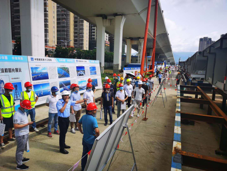 2020年6月28日,由龍巖城市發(fā)展集團有限公司主辦,龍巖市政建設集團有限公司(市城投公司)承辦,北京鐵研建設監理有限公司、中國建筑第六工程局有限公司、中冶(上海)鋼結構科技有限公司協(xié)辦的龍巖大道高架橋項目質(zhì)量安全標準化觀(guān)摩會(huì )在龍巖大道高架橋主橋鋼箱梁工程現場(chǎng)舉行。觀(guān)摩會(huì )分拼裝區域、提升站區域、頂推滑移區域、步履滑移區域及主橋轉體區域分別展示了龍巖大橋主橋鋼結構拼裝、提升、弧形頂推滑移、步履滑移等新工藝及主塔“水平二次轉體”、鋼箱梁頂推、斜拉索施工技術(shù)。