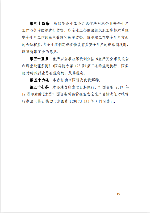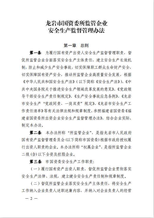 龍巖市國資委關(guān)于印發(fā)《龍巖市國資委所監管企業(yè)安全生產(chǎn)監督管理辦法》的通知(龍國資[2020]62號)