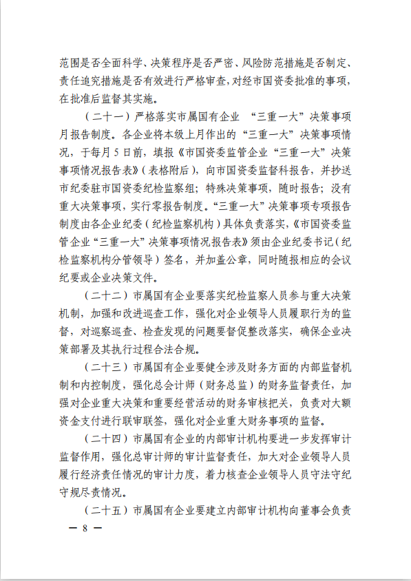 關(guān)于進(jìn)一步規范市屬?lài)衅髽I(yè)貫徹落實(shí)“三重一大”決策制度實(shí)施意見(jiàn)(國資黨委[2020]21號)