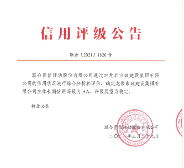 2021年3月29日,經(jīng)國內權威評級機構聯(lián)合資信評估有限公司評級專(zhuān)家集體分析、研究、決議,一致通過(guò)給予龍巖市政建設集團有限公司AA主體信用評級,評級展望穩定。