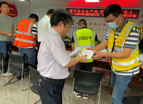 現場(chǎng)徐旺興董事長(cháng)、修海金副總經(jīng)理分別向項目部人員及工人現場(chǎng)分發(fā)《安全生產(chǎn)法》及“五進(jìn)”等宣傳資料。